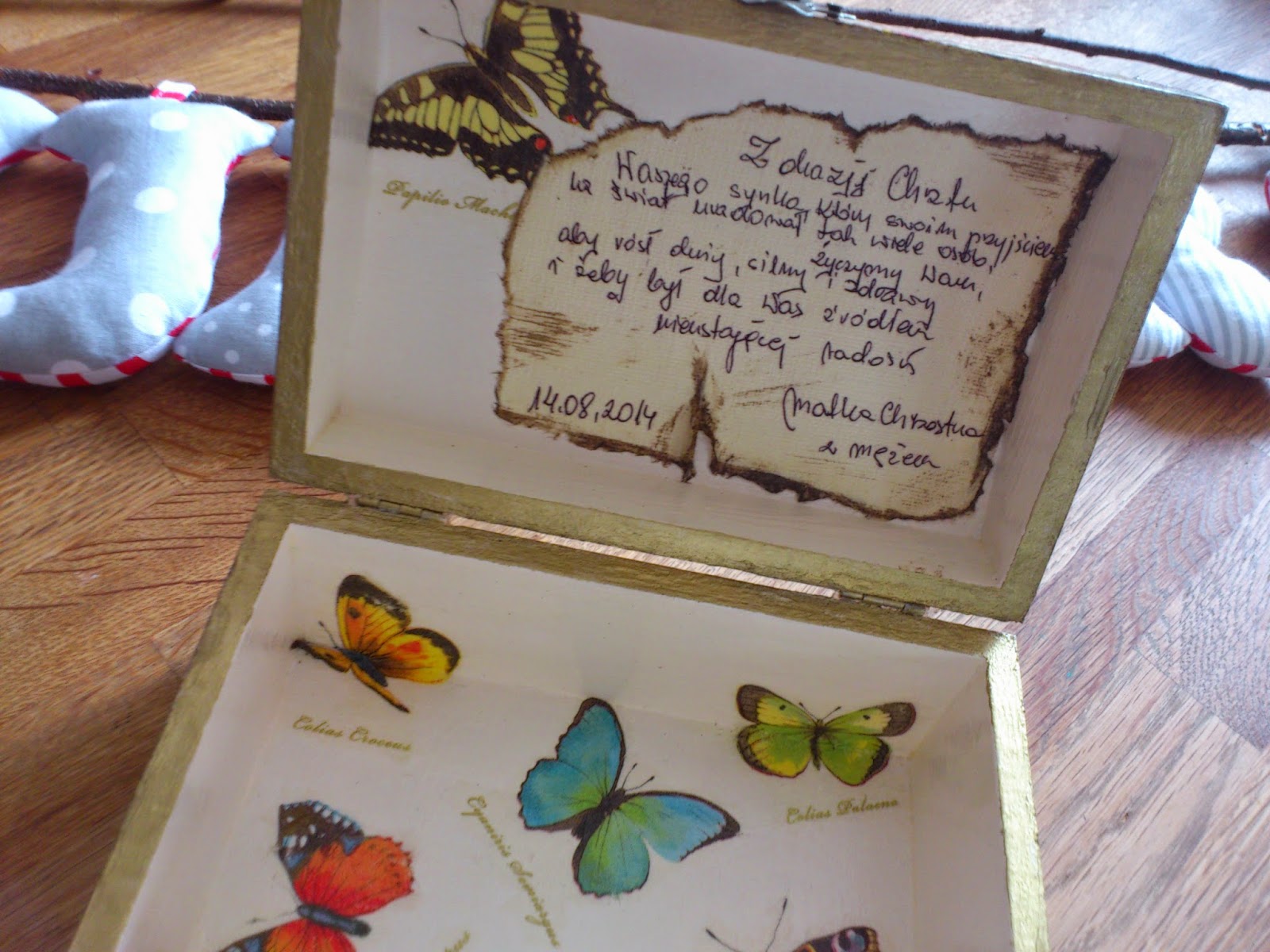Jak wcześniej wspomniałam, kolejna szkatułka książka - koperta. Jasna, bez dodatkowych ozdób- bo takie było życzenie. Motyw na wieku uroczy i myślę, że kochają go wszyscy.....